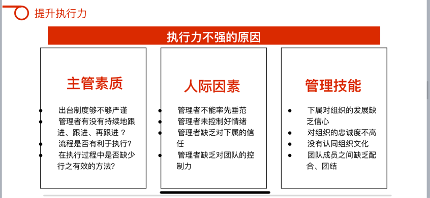 生動形象地幫助大家建立了對執(zhí)行力的結構化認知,更進一步理解到了工作態(tài)度、工作職責、工作任務、工作結果的邏輯聯(lián)系,以及如何在強化執(zhí)行力的同時,提高部門運作效率,使效能與效率相輔相成,創(chuàng)造出更高的部門績效。